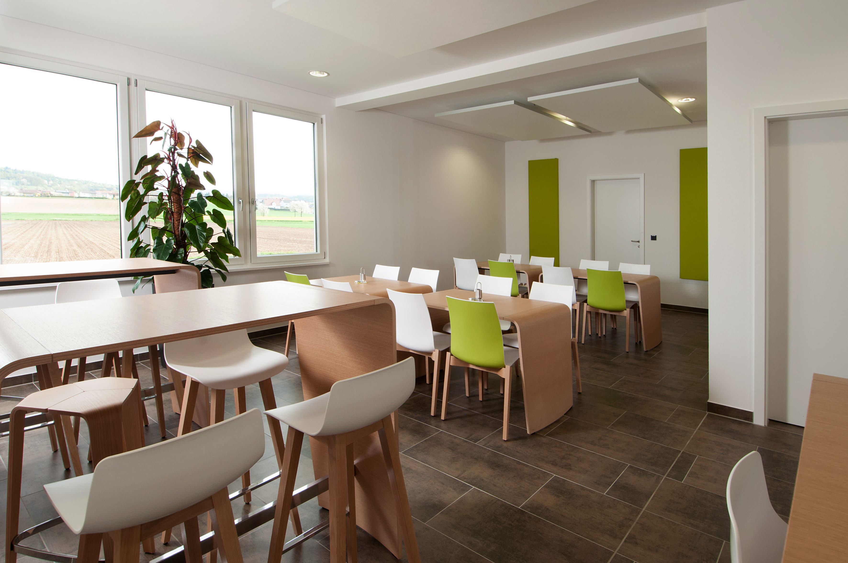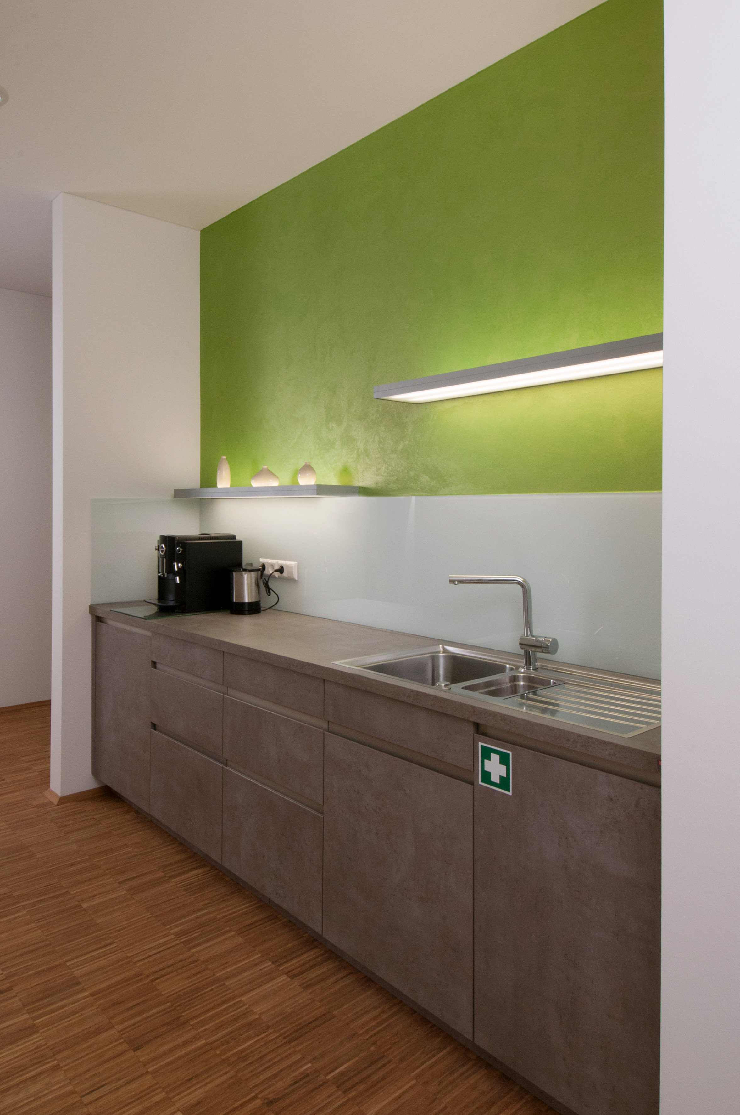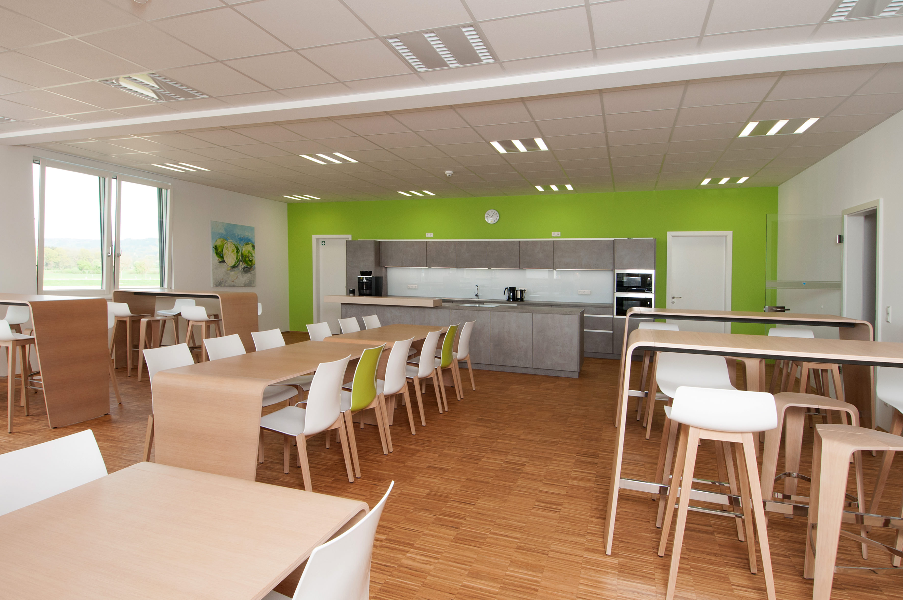 So gibt es heute als Resultat beispielsweise Gruppen- und Einzelbüros – je nach Arbeitsauftrag eines Mitarbeiters. Die neuen Arbeitsplätze sind ergonomisch gestaltet.Insbesondere für Schulungs-, Aufenthalts- und Cateringbereiche für Mitarbeiter und externe Schulungsteilnehmer galt es, ein Gesamtkonzept zu entwickeln.fritzoffice fertigte vier Küchen nach Maß und richtete Empfang, Lounges, Schulungs- und Konferenzräume, Garderoben und Wartebereiche ein.