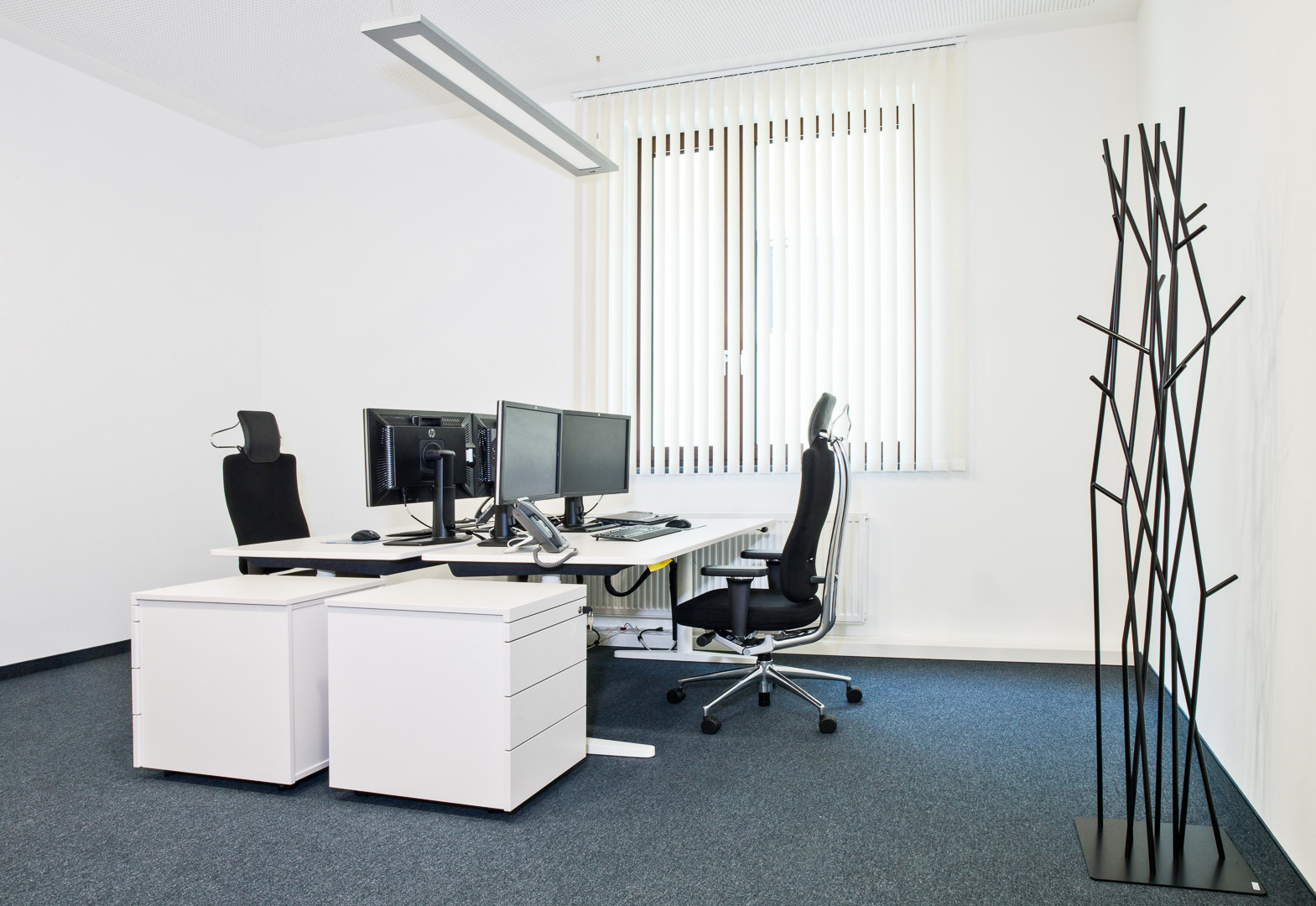 Für die Mitarbeiterarbeitsplätze kamen zeitgemäße Sitz-Steharbeitstische zum Einsatz. So erfüllen z.B. die Drehstühle einen hohen ergonomischen Standard, der beim Sitzen Bewegung zulässt und zeitgleich den Körper stützt.