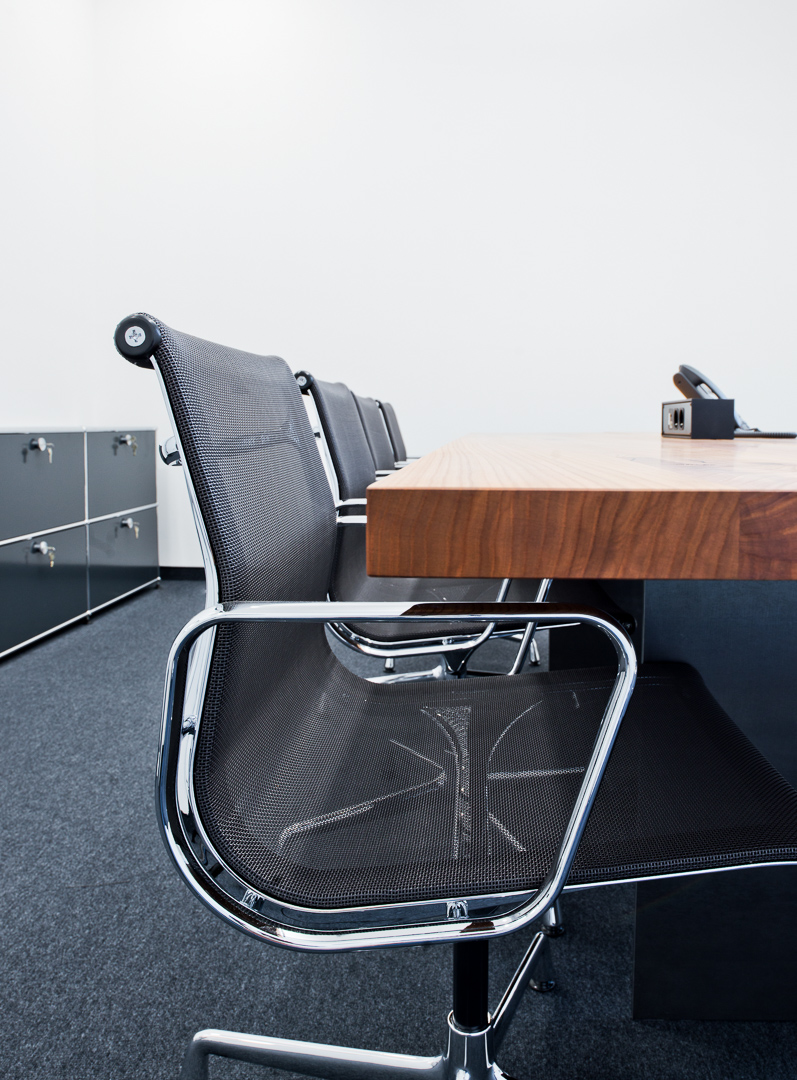 Für den Besprechungsraum z.B. kombinierte fritzoffice USM: Sideboard; Werner Works: Tisch mit Massivholzplatte aus Nussholz und Gestell Rohstahl geölt; Vitra: klassische Aluchairs.