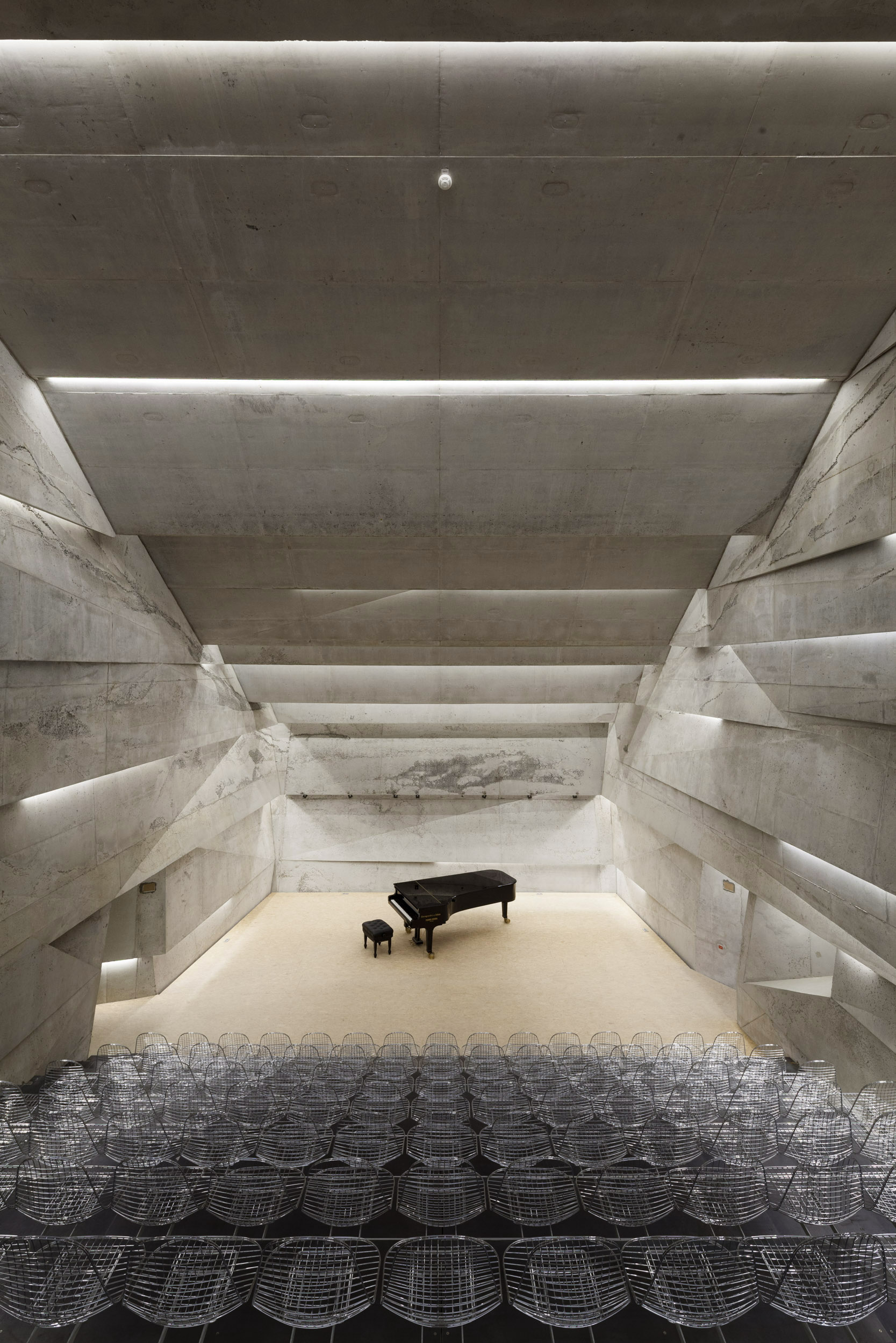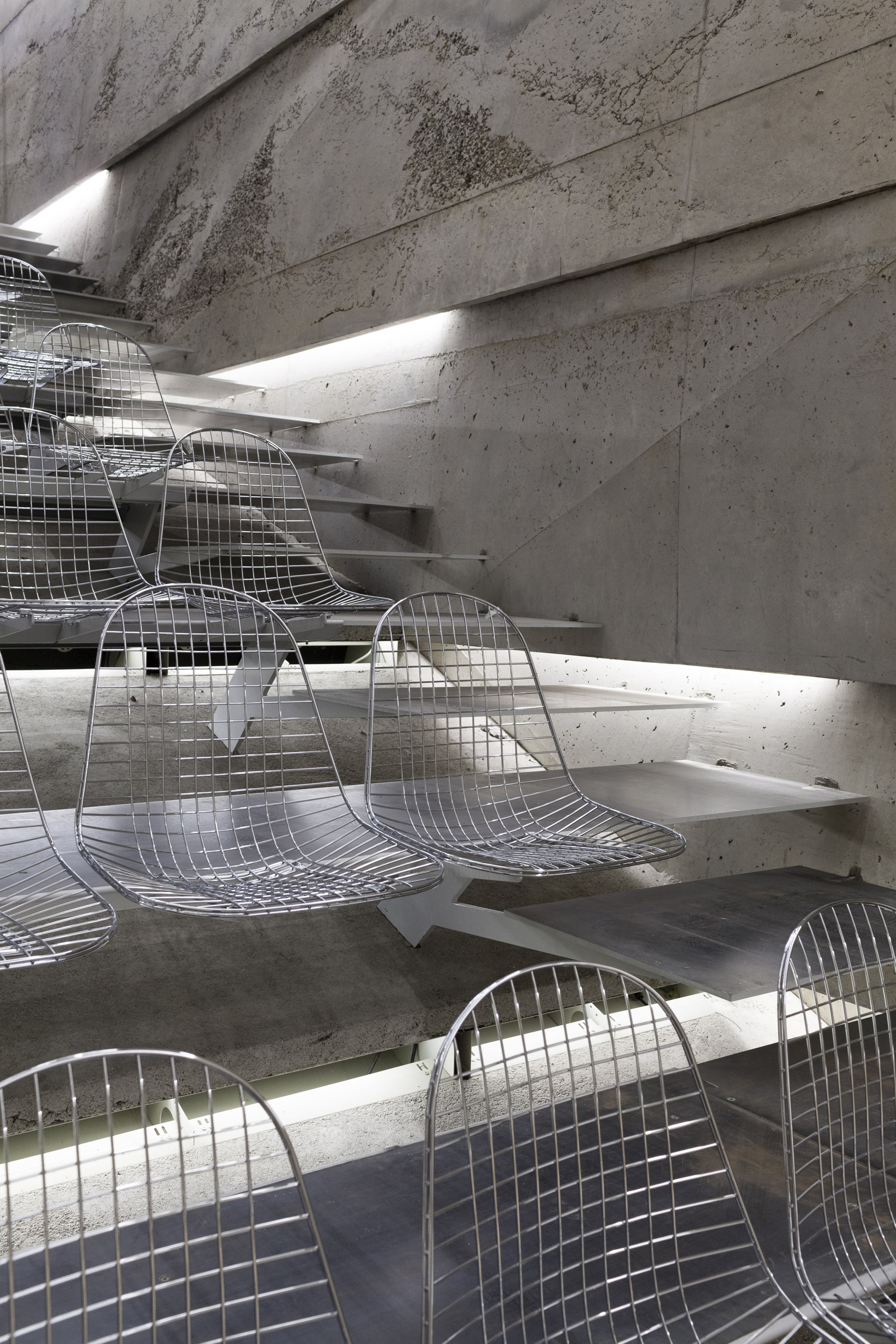 Der Architekt plante eine schwebende Optik für die Stuhlreihen und entwarf eine Spezialkonstruktion in Form von Aluminiumschwertern, die auf die bestehenden Podeste im Konzertsaal installiert wurden und auf denen dann die Sitzschalen angebracht wurden.