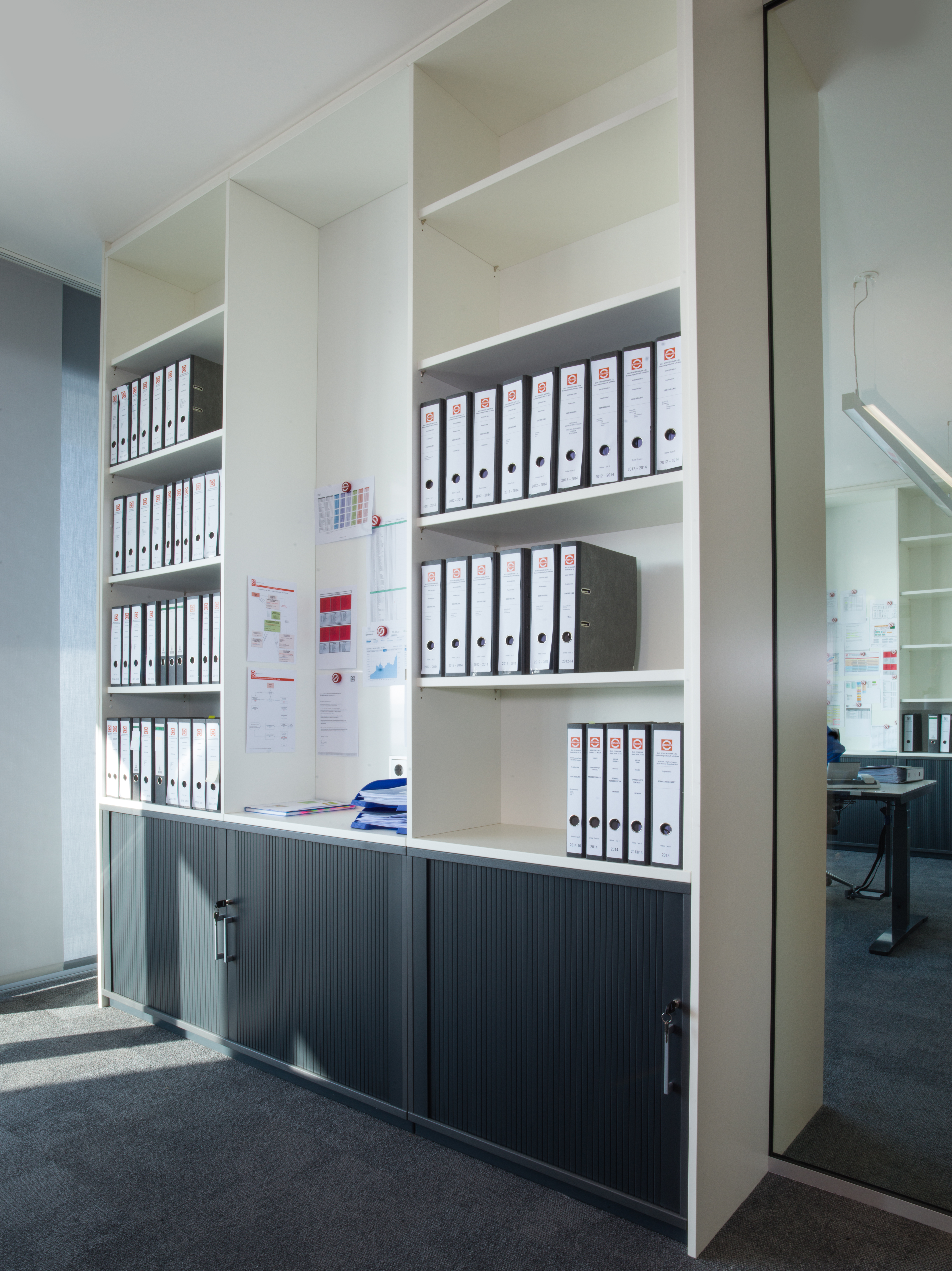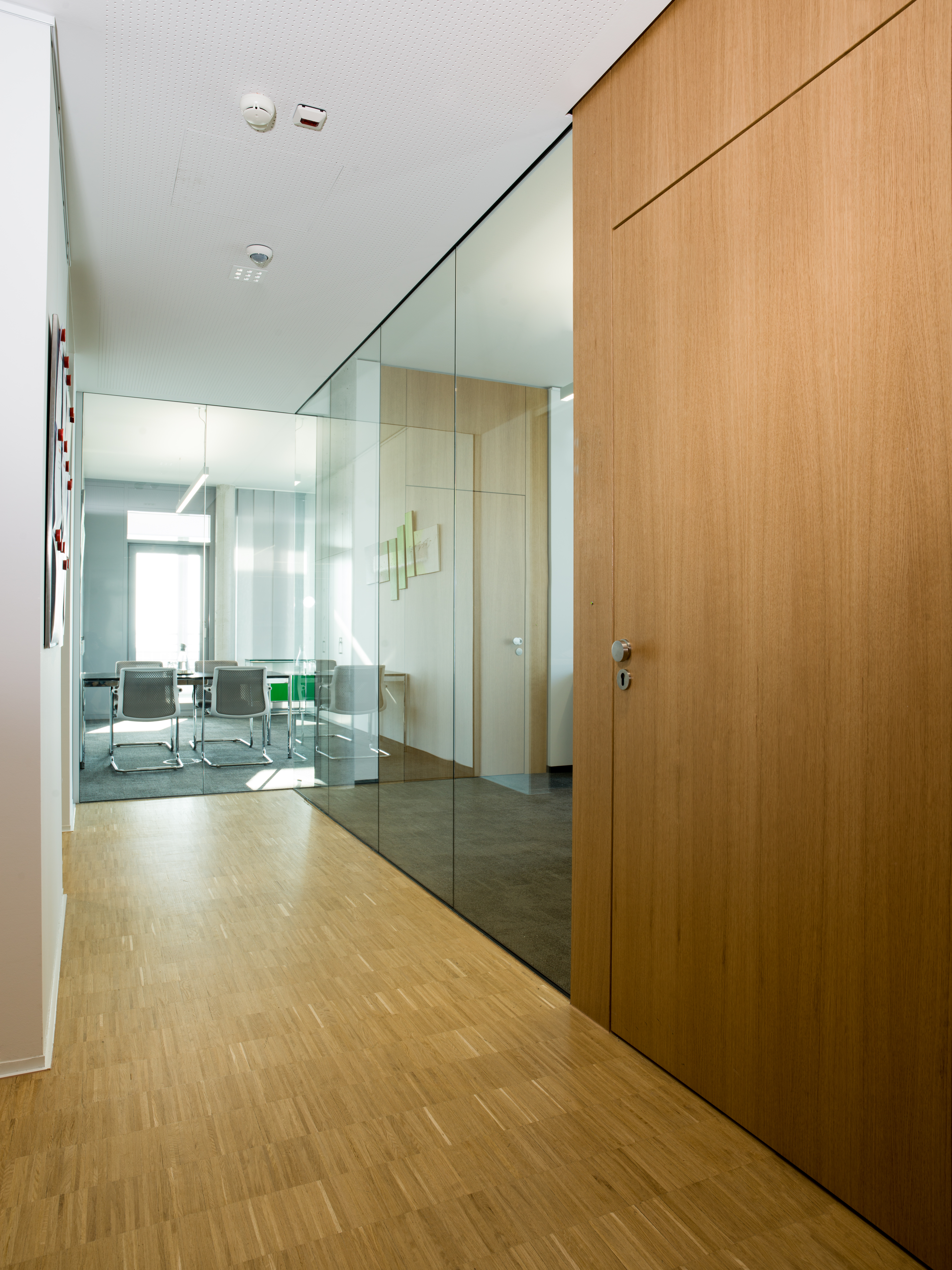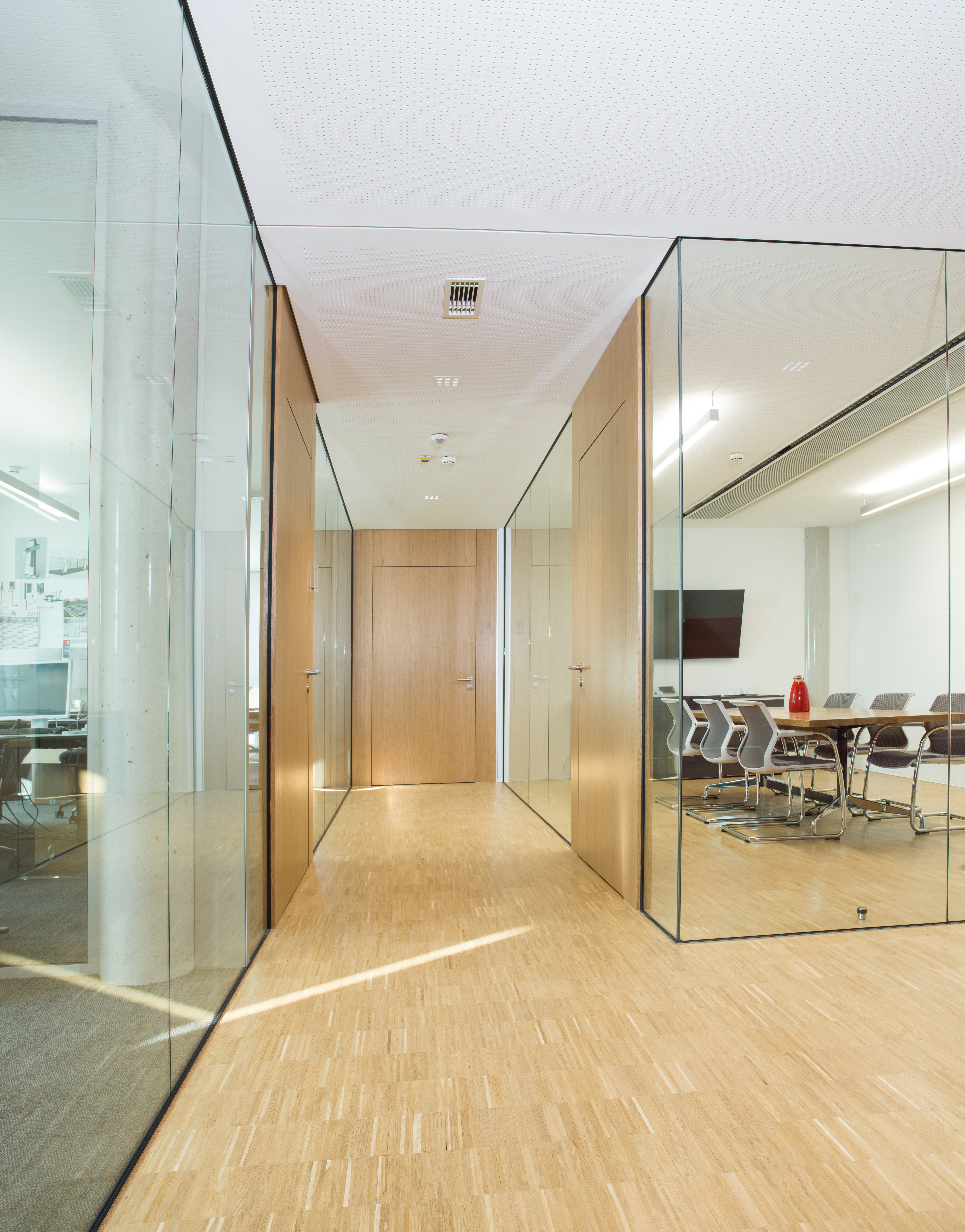 fritzoffice entwarf ein offenes Innenraumkonzept mit raumteilenden Schrankwänden und eine besondere Detaillösung für die Flurwände: Diese bestehen ausschliesslich aus rahmenlosen Glastrennwänden. So entstand im 1. bis 6. Obergeschoss die gewünschte offene Bürolandschaft.