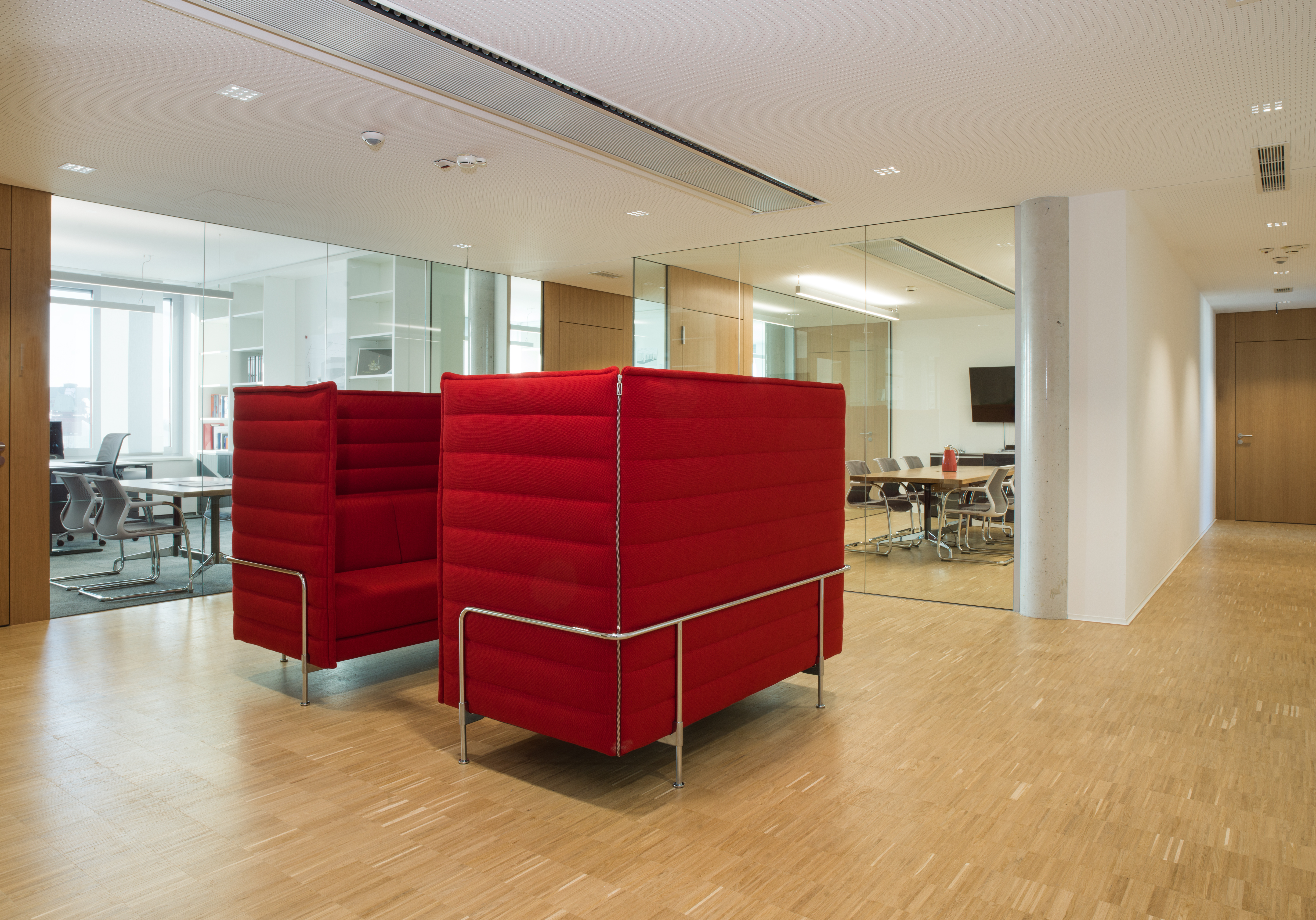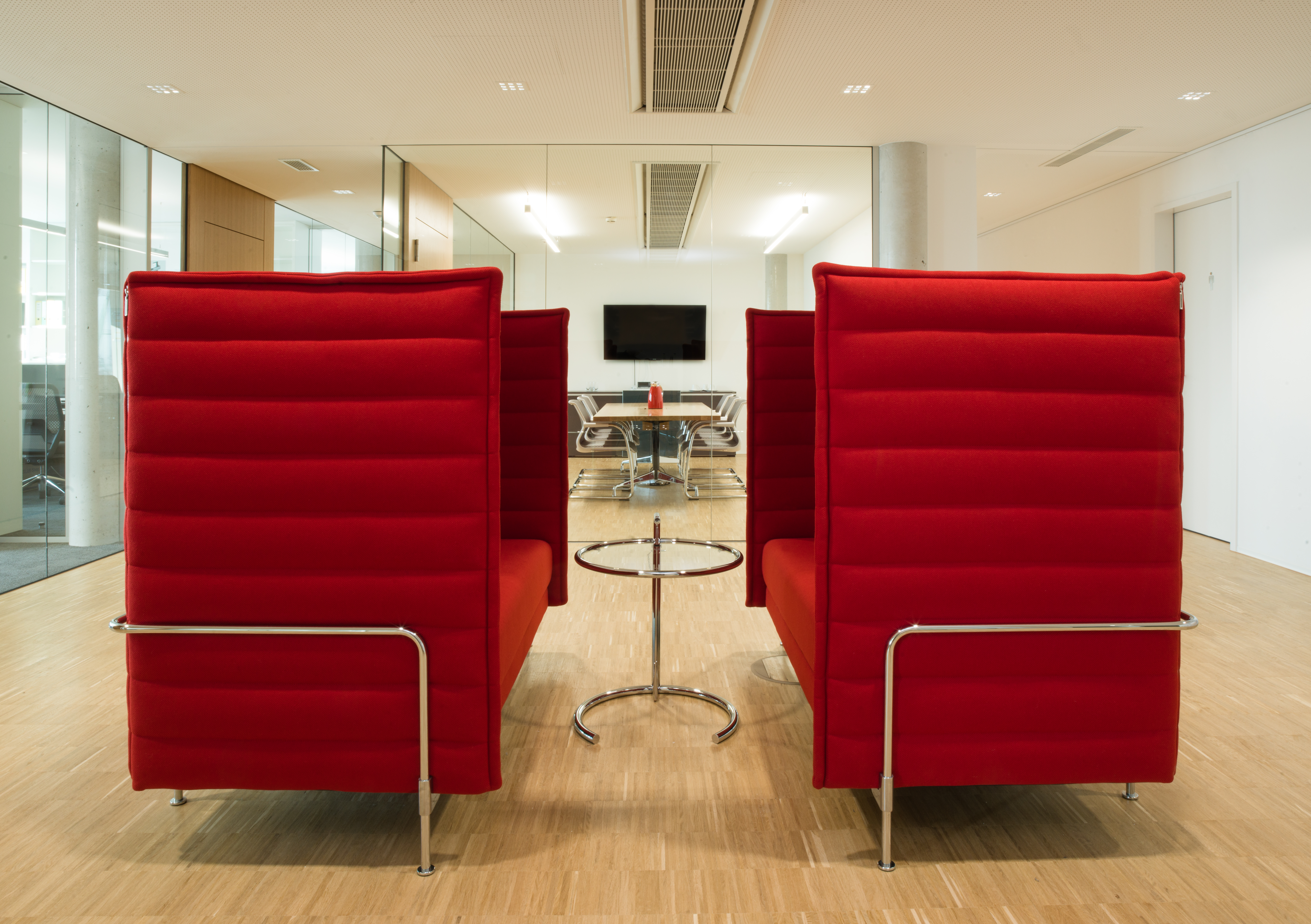 Zusätzlich entstanden Rückzugslandschaften z.B. in Form der roten Alcoven-Sitzgruppen. Auf jeder Etage befinden sich zusätzlich diverse Besprechungsräume für Teammeetings sowie Teeküchen. Im obersten Stockwerk entstand ein wertiges und ansprechendes Chefbüro mit USM Haller und Vitra Möbeln.
