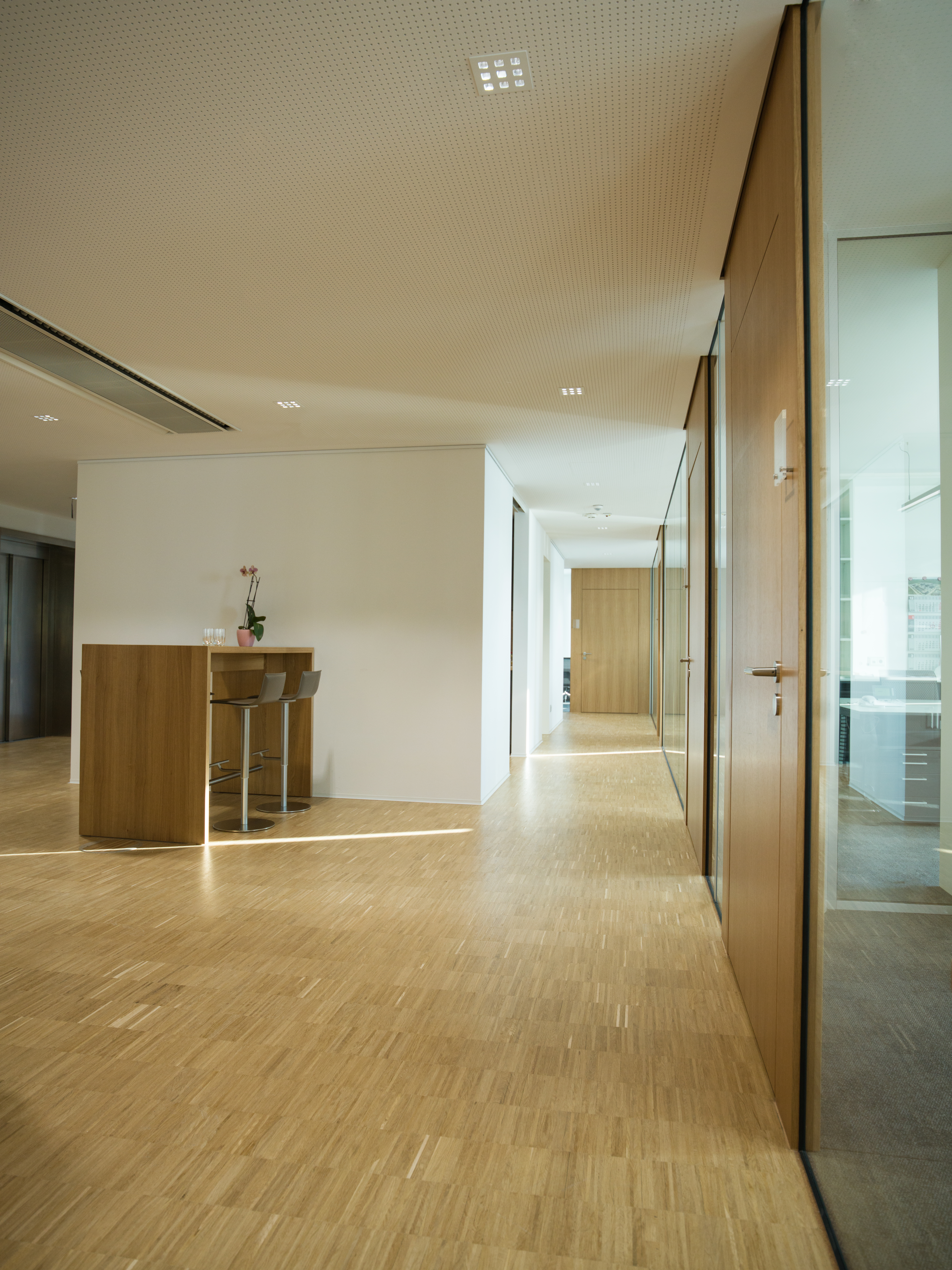 Die Teambüros für 4-6 Mitarbeiter und Gruppenbüros für 6-8 Mitarbeiter wurden nach höchsten Schalldämmungsansprüchen und ergonomischen Standards ausgestattet. Durch die Glaswände als Alternative zur Wand entstand eine weitläufige und kommunikative Arbeitsumgebung.