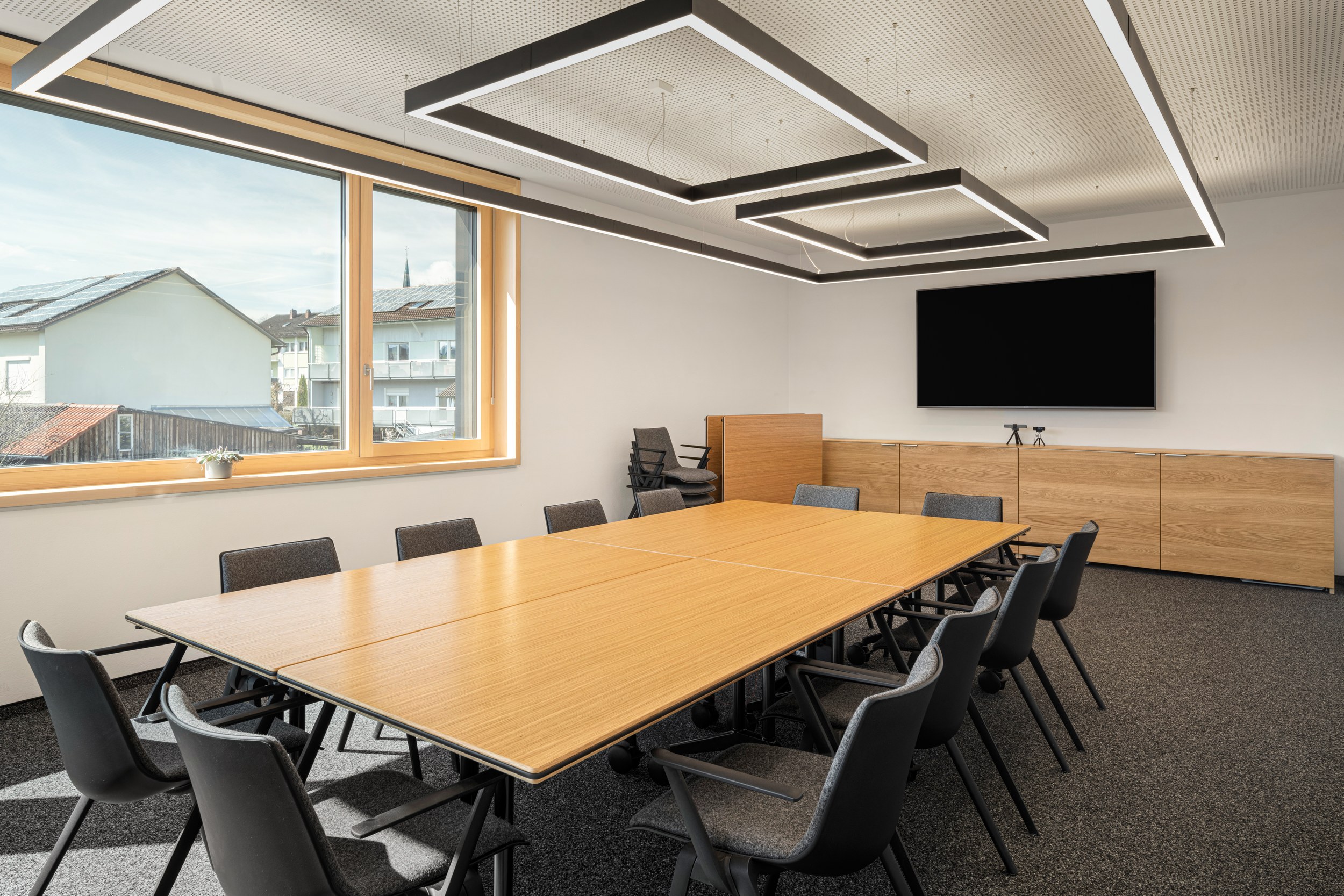 Im Seminarraum wurde der benötigten hohen Flexibilität durch den Einsatz mobiler Tische und leicht stapelbaren Stühlen gerecht. So kann der Raum optimal den unterschiedlichen Nutzungsbedingungen angepasst werden.