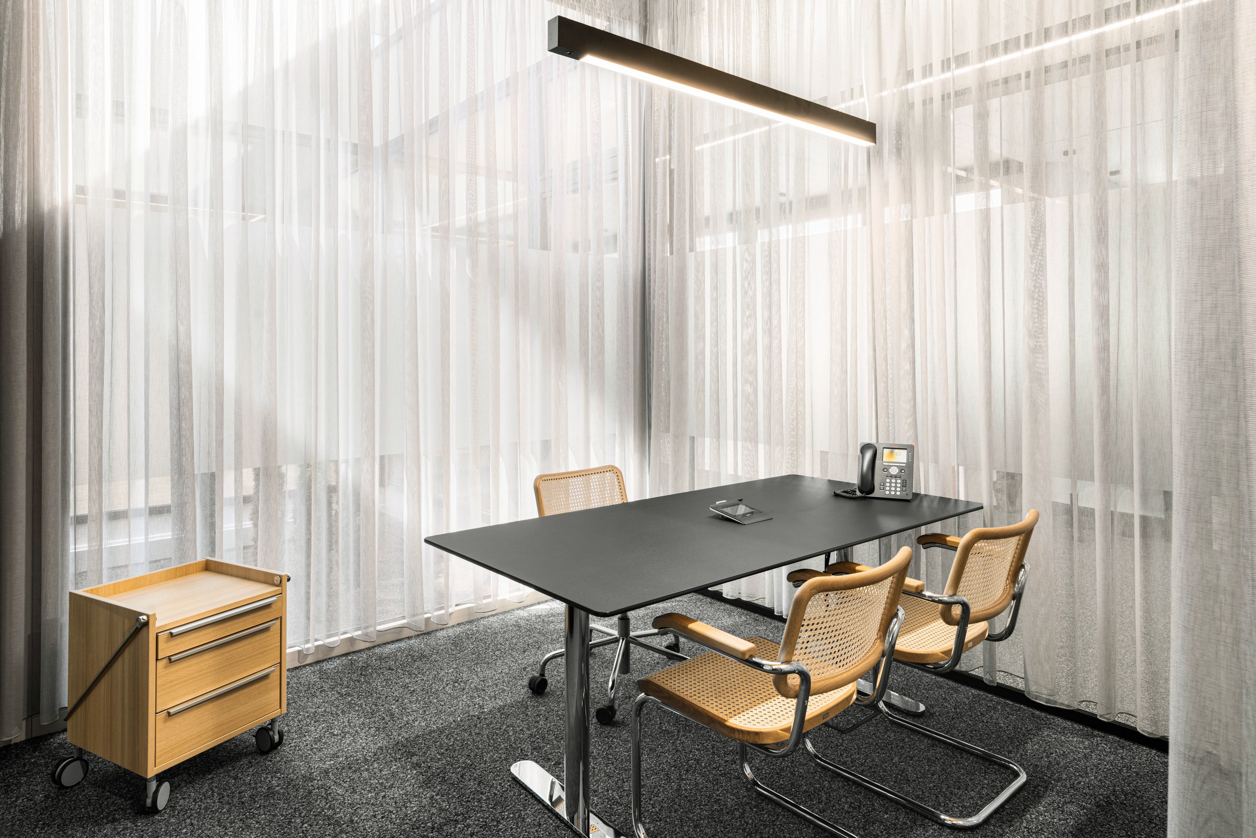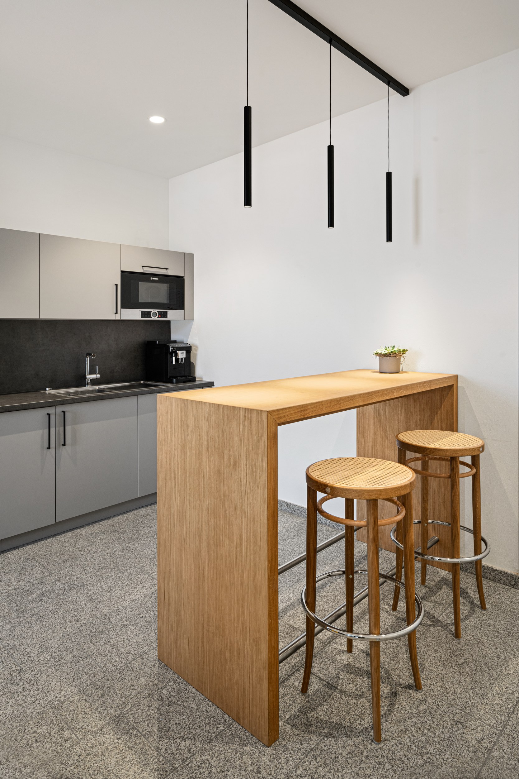 Zudem lag der Fokus insbesondere auf der Schaffung einer wohnlichen Atmosphäre. Dafür sorgen beispielsweise Stuhl-Klassiker von Thonet: Sitz und Rückenlehne sind aus Massivholz mit Rohrgeflecht und verkörpern Tradition, das Gestell Gegenwart und Zukunft.