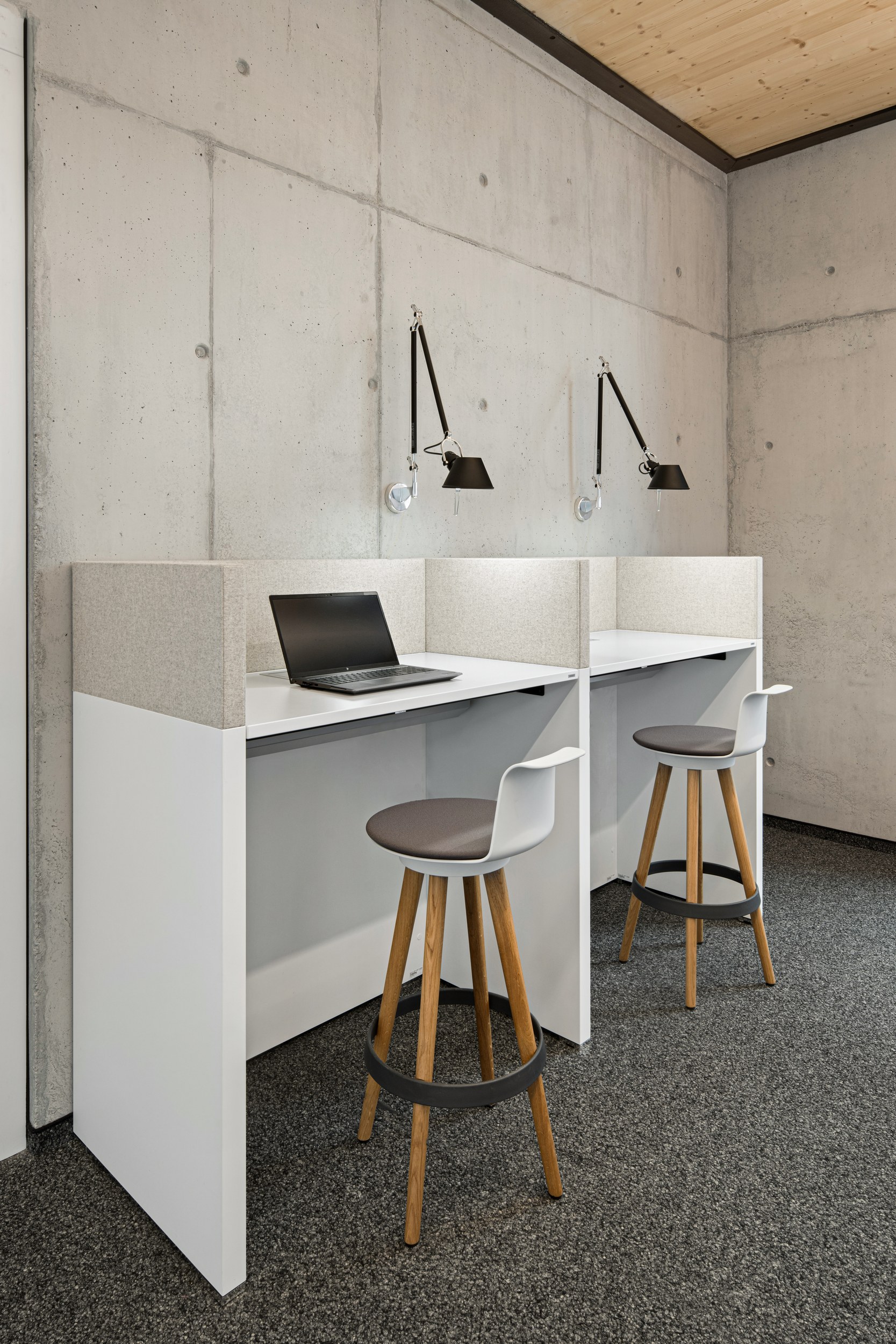 Entstanden sind Büroarbeitsplätze für Mitarbeiter und die Geschäftsleitung sowie die Empfangstheke, Mittelzonen, Besprechungszonen in den Cubes sowie der Seminarraum.