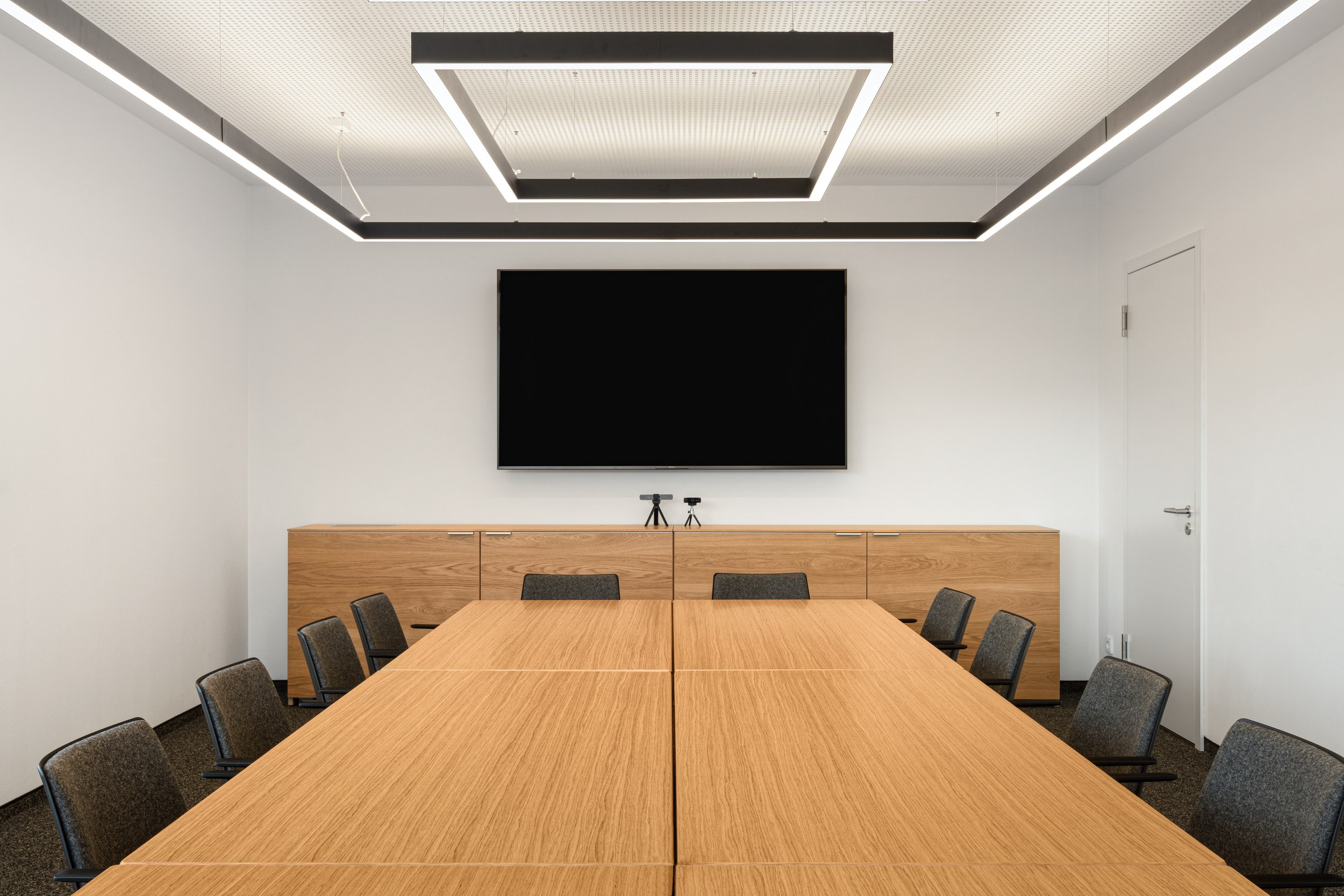 Trotz offener Strukturen, konnte mit VARIO CONCLUSION eine visuelle und akustische Abschirmung der Arbeitsplätze geschaffen werden und ein hohes Maß an Privatsphäre verwirklicht werden. Gerade bei den großräumigen Bereichen, kommen die raumbildenden Fähigkeiten dieses Systems voll zum Tragen. Ausgestattet mit akustisch wirksamen Paneelen bietet VARIO CONCLUSION Rückzugsmöglichkeiten und schafft die Grundlage für Konzentration und Ruhe. Somit behält der transparente Raum sein ruhiges Erscheinungsbild. Im Mittelpunkt stehen verglaste Beratungs-Cubes mit modernster Medientechnik, die auch eine vertrauliche Gesprächsatmosphäre gewährleisten.